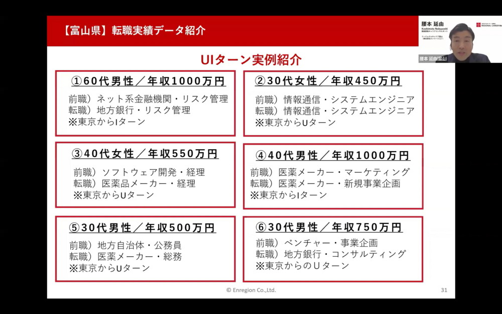 北陸へのUIターン転職を検討している・興味のある方を対象に、オンラインセミナーを開催しました。地域に特化しているエンリージョンだからこそ伝えられる、リアルな転職事情や実際の転職事例、納得のいく転職を実現するためのポイントなどをお届けしました。