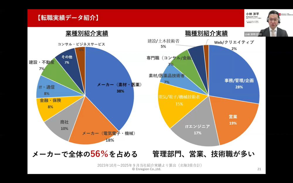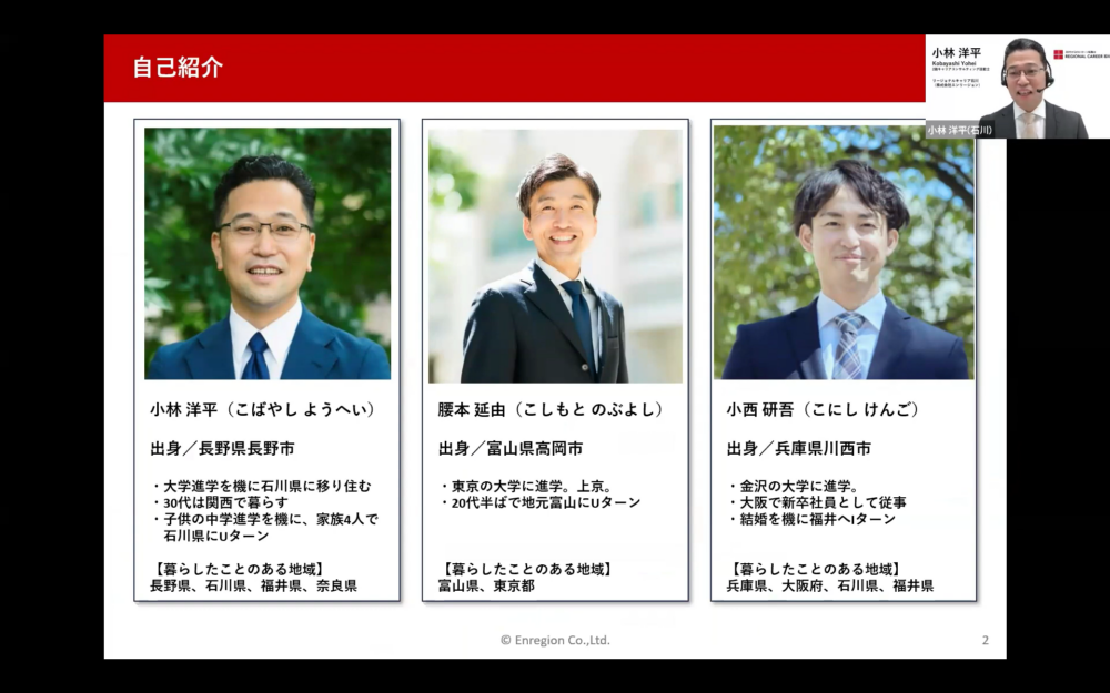 北陸へのUIターン転職を検討している・興味のある方を対象に、オンラインセミナーを開催しました。地域に特化しているエンリージョンだからこそ伝えられる、リアルな転職事情や実際の転職事例、納得のいく転職を実現するためのポイントなどをお届けしました。